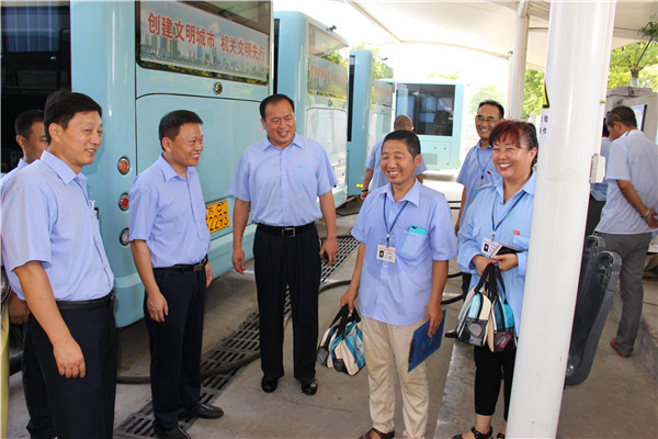 炎炎烈日下,空調(diào)公交車(chē)成為市民出行首選。為給市民營(yíng)造舒適、涼爽的乘車(chē)環(huán)境,各運(yùn)營(yíng)公司應(yīng)用公交GPS智能調(diào)度系統(tǒng),科學(xué)調(diào)度、靈活排班、保證運(yùn)力充足。同時(shí),結(jié)合創(chuàng)建工作,提高服務(wù)質(zhì)量,全市2100多輛空調(diào)車(chē)全部開(kāi)足冷氣;駕乘人員揮汗如雨堅(jiān)持“一趟一清掃”,認(rèn)真做好車(chē)輛清潔工作;督導(dǎo)隊(duì)員冒著高溫在各大站臺(tái)維持秩序、扶老攜幼、做好導(dǎo)乘服務(wù)、嚴(yán)查易燃易爆及危險(xiǎn)品。由于各項(xiàng)舉措落實(shí)到位,確保了高溫期間全市161條公交線(xiàn)路運(yùn)營(yíng)順暢,乘客走好走了。(圖為董事長(zhǎng)、總經(jīng)理杜紅軍,總經(jīng)理助理李修超一行在食品城充電站慰問(wèn)堅(jiān)守崗位的充電員工。)
