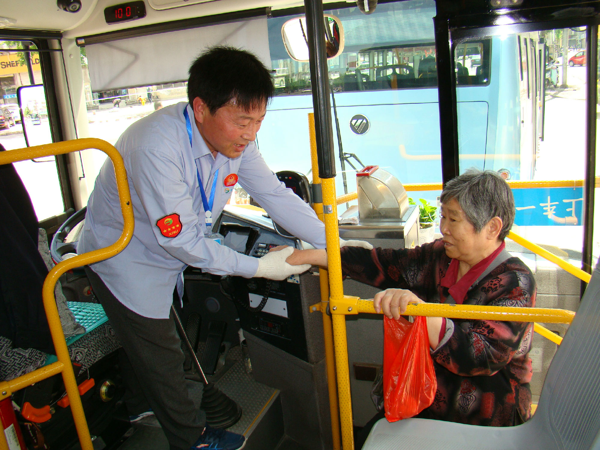 為有效提高老年人乘車安全系數(shù),公司為14路線在車廂內(nèi)設(shè)置“老幼病殘?jiān)小睈坌膶W幕A(chǔ)上,專門設(shè)置了“敬老專座”; 為了給老年乘客提供優(yōu)美的乘車環(huán)境,還在車廂的頂部和前部放置各種綠色植物和鮮花,同時(shí),在駕駛座后面安裝了便民袋,配備常用藥物、老花鏡、針線包、意見簿及公交乘車指南、報(bào)紙、老年人專用雨披等物,讓老年乘客登上公交車,就能感受到清新氣息。