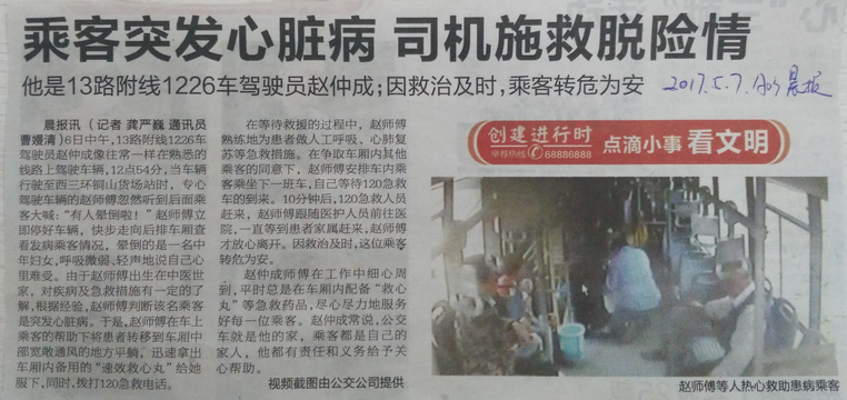 當(dāng)天中午,13路附線1226車駕駛員趙仲成像往常一樣在熟悉的線路上駕駛車輛。12點(diǎn)54分,當(dāng)車輛行駛至西三環(huán)銅山貨場站時,專心駕駛車輛的趙師傅忽然聽到后面乘客大喊:“有人暈倒啦”,趙師傅立即停好車輛、快步走向后排車廂查看發(fā)病乘客情況,暈倒的是一名中年婦女,呼吸微弱、輕聲地說自己心里難受。由于趙師傅出生在中醫(yī)世家,對疾病及急救措施有一定的了解,根據(jù)經(jīng)驗(yàn),趙師傅判斷該名乘客是忽發(fā)心臟病,于是,趙師傅在車上乘客的幫助下將患者轉(zhuǎn)移到車廂中部寬敞通風(fēng)的地方平躺,迅速拿出車廂內(nèi)備用的“速效救心丸”給她服下,同時,撥打120急救電話。在等待救援的過程中,趙師傅熟練地為患者做人工呼吸、心肺復(fù)蘇等急救措施。在爭取車廂內(nèi)其他乘客的同意下,趙師傅安排車內(nèi)乘客乘坐下一班車,自己等待120急救車的到來。10分鐘后,120急救人員趕來,趙師傅跟隨醫(yī)護(hù)人員前往醫(yī)院,一直等到患者家屬趕來,趙師傅才放心的離開。